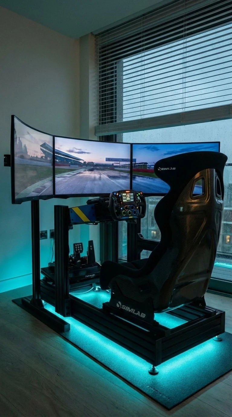 We engineer our racing environments using industrial-grade SimLab aluminium chassis to ensure zero-flex under high load. To replicate the visceral physics of a GT3 or Formula car, we specify high-torque Direct Drive steering motors, hydraulic load-cell pedals, and Buttkicker haptic transducers. This ensures that every nuance of the track surface—from tyre slip to gear shifts—is felt with surgical accuracy.